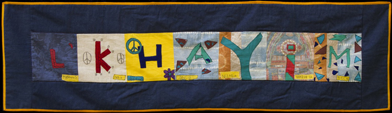 L'KHAYIM is a transliteration of the Yiddish version of the more well known Hebrew "l'chaim", to life. Yiddish was traditionally the secular language of the Jews of Eastern Europe while Hebrew was reserved for religious practice. This quilt was made by the 1998 B'nai Mitzvah class at the Peretz Centre for Secular Jewish Culture in Vancouver British Columbia Canada.