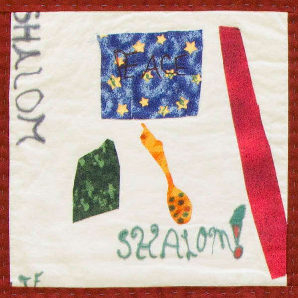 To the third through sixth grade classes of Agudus Achim Religious School, under the direction of Rabbi Tracy Klirs, the meaning of "Middle East Peace Quilt" is simple. We teach "Mitzvot" each month; this month our "Mitzvot" is "Rodef Shalom", (to pursue the peace). We teach that the pursuit of peace is one of the most God-like things we can do. Peace doesn't just happen. We need to seek out peace and make it happen. Discussing and contributing to the Middle East Peace Quilt for this lesson plan was a great way for the children to think of the peace process in the MIddle East, and a wholeness in the world.