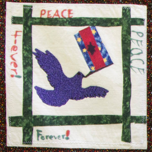 When I first started this project I had no idea whether I was going to get a dozen quilt squares or a hundred, but every day, as the original deadline for submissions grew near, I would walk eagerly up to the post office to check my box. Often there would be nothing, sometimes one piece and on a really good day two would arrive at the same time. But on one particular day I found a large package waiting for me. I opened it and found inside not one, not two but 25 quilt squares made by the grade 3 to 6 students of Agudus Achim, and all of them were beautiful. Not only that, but they also enclosed a cheque for $125.00, a five dollar donation for each of the children's squares. I was moved and impressed by the donation, because it showed respect for both the quilt project and the work of the individual children.