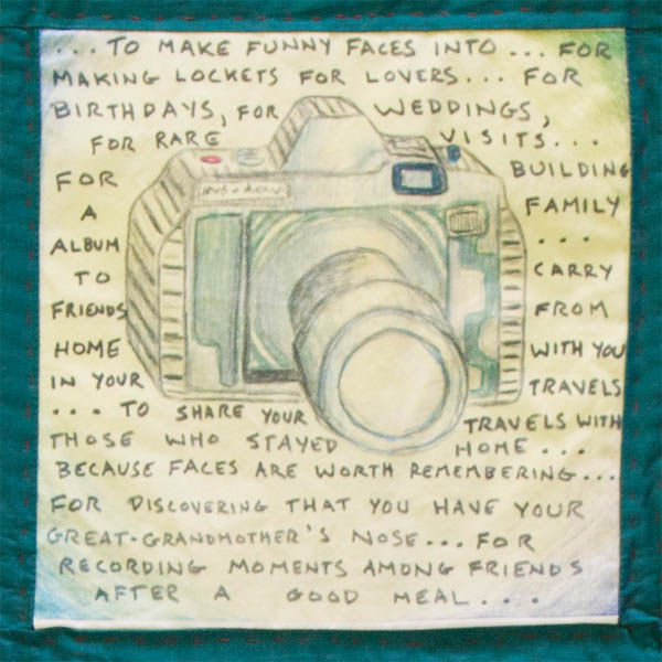 Certain objects and images are the property of war---guns, tanks, camoflauge clothing etc. Others are essentially associated with peace---people holding hands, perhaps, peace symbols, smiling children. Some objects and images however, occupy a kind of nether zone, and can be part of a vision of war or one of peace, depending on their context, on how they are used. For me, the camera, and by extension, the photograph, is one of these flexible icons. Nearly all of the photographs that have made their way from the MIddle East into my peaceful western Canadian world have depicted atrocities. They have catalogued violence, captured moments of hostility and aggression, of pain and fear; they have been used as evidence of crimes and as justification of further crimes; they have documented and in some way perpetuated the war. In my life, in my vision of peace, that is not what the camera is. In peacetime, the photograph has to do with leisure, not with grim newspaper headlines. There are so many better things one can use a camera for.